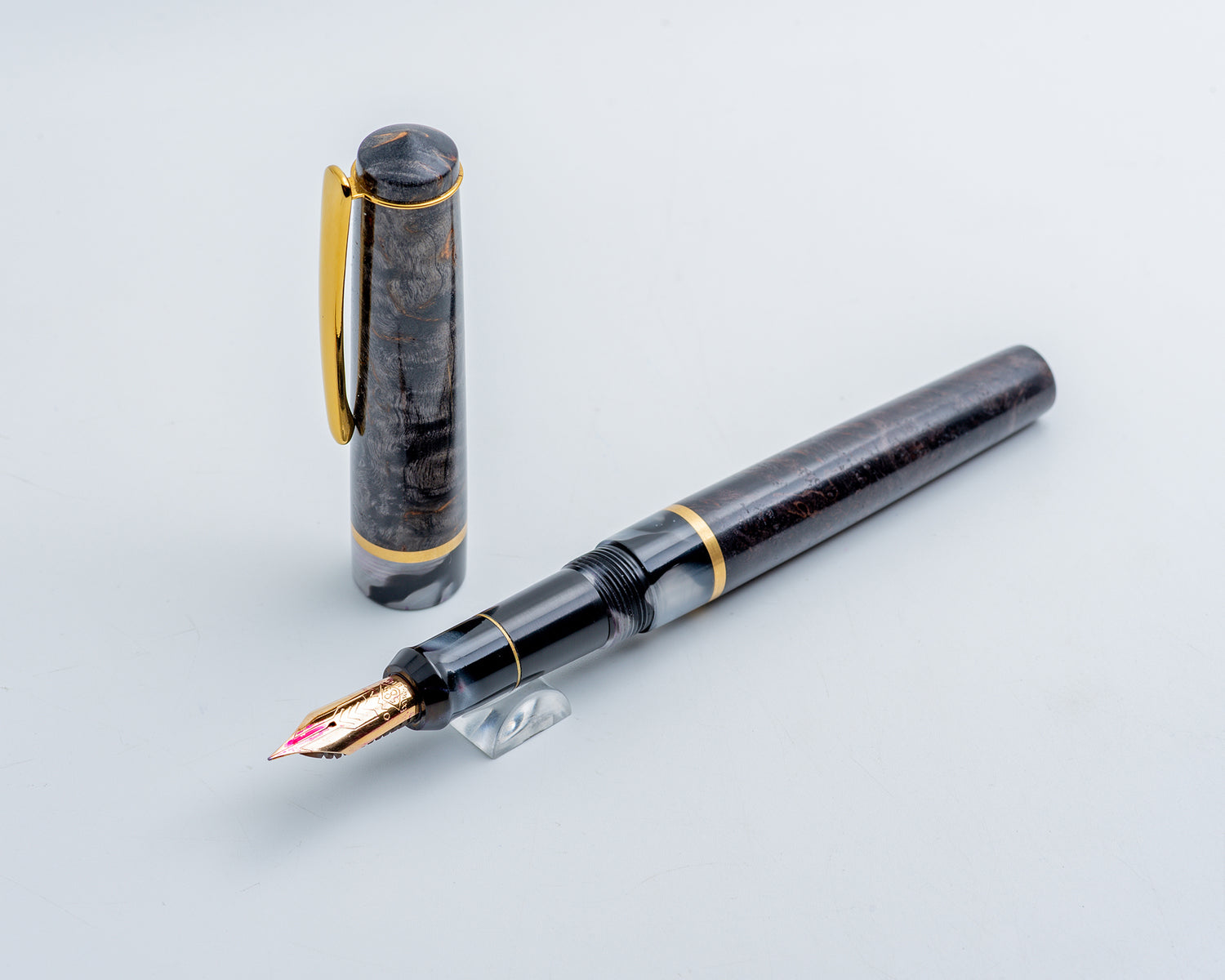 Dyed/Stabilized Karelian Birch & Black Ash Burl, Silver Swirl Acrylic, Brass Accents & Titanium Nitride-coated Clip | For Omas Extra Lucens nib