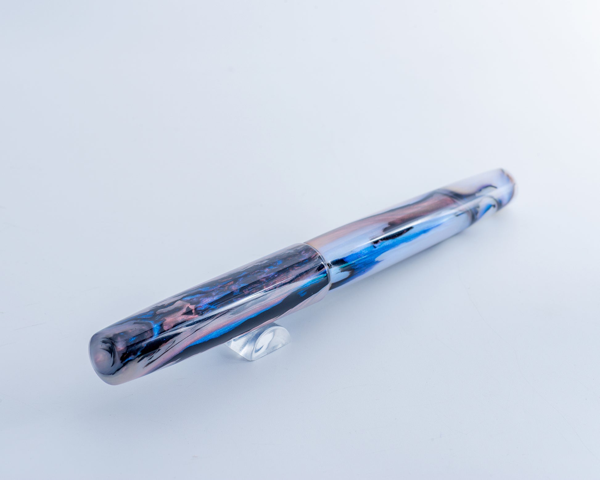Take your writing experience up several notches with this one-of-a-kind, handmade fountain pen! Carefully crafted from a gorgeous, ethereal faux Abalone resin, this pen will be turning heads left, right, and center. The generous section has an exceptionally comfortable taper, and the light weight of the resin construction makes for an excellent performer in long-form writing. This pen is compatible with Jowo #6 nibs. Sporting smooth, single-start threads, this pen will serve you well for years to come. Takes standard international cartridges & converters, or can be eye-dropper filled with silicone grease on the threads!