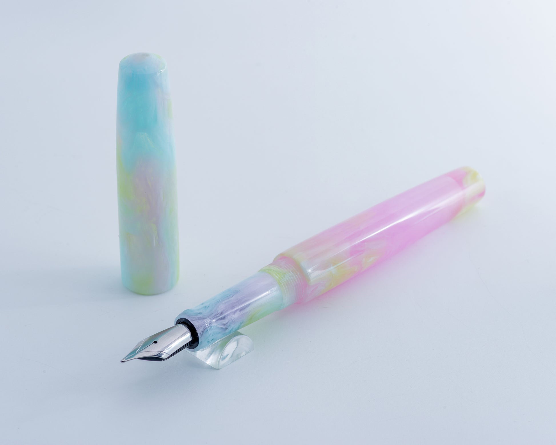Take your writing experience up several notches with this one-of-a-kind, handmade fountain pen! Carefully crafted from a beautifully whispy, spring-evoking resin, this pen will be turning heads left, right, and center. The generous section has an exceptionally comfortable taper, and the light weight of the resin construction makes for an excellent performer in long-form writing. This pen is compatible with Jowo #6 nibs. Sporting smooth, single-start threads, this pen will serve you well for years to come. Takes standard international cartridges & converters, or can be eye-dropper filled with silicone grease on the threads!
