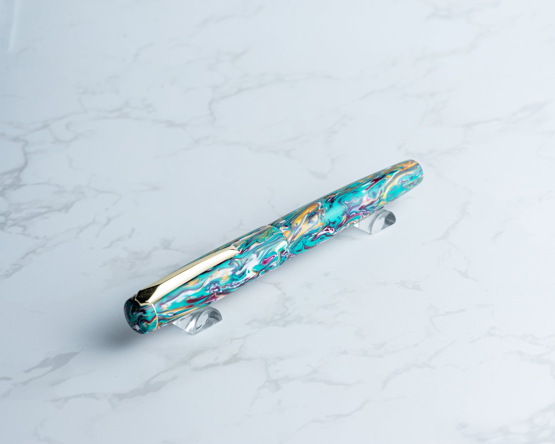 Take your writing experience up several notches with this one-of-a-kind, handmade fountain pen! Carefully crafted from "End of Summer Bash" resin from Unbelievable Blanks - a fun, bright blend of flat teal, white, and burgundy mixed with shimmering gold - this pen will be turning heads left, right, and center. The generous section has an exceptionally comfortable taper, and the light weight of the resin construction makes for an excellent performer in long-form writing. This pen is compatible with Jowo #6 nibs. Sporting smooth, triple-start threads, this pen will serve you well for years to come. Takes standard international cartridges & converters, or can be eye-dropper filled with silicone grease on the threads!